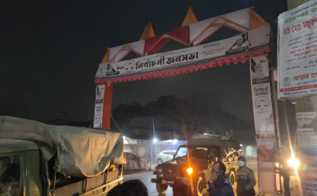 বুধবার (৪ ফেব্রয়ারি) দিবাগত রাতে নির্বাচনি আচরণবিধি লঙ্ঘনের অভিযোগে চাঁপাইনবাবগঞ্জ শহরের বিশ্বরোড মোড়ে বাঁশ ও কাপড় দিয়ে তৈরি তোরণটি ভেঙে ফেলা হয়।