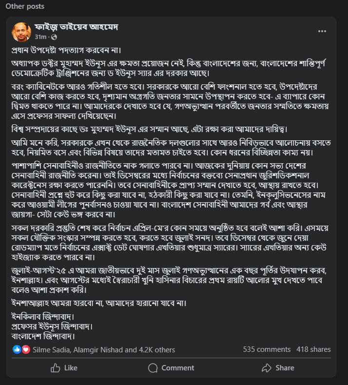 শুক্রবার নিজের ফেসবুক পেইজে প্রধান উপদেষ্টার আইসিটি বিষয়ক বিশেষ সহকারী ফয়েজ আহমদ তৈয়্যব এসব কথা বলেন।