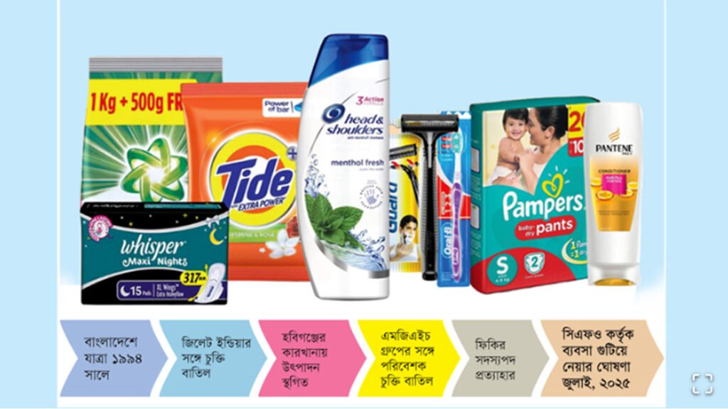 বিশ্বের অন্যতম ফাস্ট-মুভিং কনজিউমার গুডস (এফএমসিজি) উৎপাদক কোম্পানি প্রক্টর অ্যান্ড গ্যাম্বল। যুক্তরাষ্ট্রভিত্তিক এ বহুজাতিক কোম্পানি বাংলাদেশে ব্যবসা শুরু করে ১৯৯৪ সালে। দীর্ঘ তিন দশকের এ ব্যবসায়িক যাত্রায় তারা বাংলাদেশের প্রাণ গ্রুপের সঙ্গে যৌথ বিনিয়োগে দেশে কারখানাও স্থাপন করেছে। তবে এবার বাংলাদেশ থেকে ব্যবসা গুটিয়ে নেয়ার সিদ্ধান্ত নিয়েছে প্রক্টর অ্যান্ড গ্যাম্বল। এ পরিকল্পনার অংশ হিসেবে এরই মধ্যে জিলেট ইন্ডিয়ার সঙ্গে চুক্তি বাতিল করা হয়েছে। পাশাপাশি বাতিল করা হয়েছে স্থানীয় পরিবেশকের সঙ্গে করা চুক্তি। প্রাণ গ্রুপের কারখানায় চুক্তিভিত্তিক উৎপাদনও বন্ধ। বৈশ্বিকভাবে ব্যবসা পুনর্গঠন ও কর্মী ছাঁটাই পরিকল্পনার অংশ হিসেবে বাংলাদেশ থেকে ব্যবসা গুটিয়ে নেয়ার কথা জানিয়েছে বহুজাতিক কোম্পানিটি। তবে এ দেশে ব্যবসা পরিচালনা করতে গিয়ে প্রতিকূল পরিস্থিতির অভিজ্ঞতাও বহুজাতিক এ কোম্পানির ব্যবসা গুটিয়ে নেয়ার সিদ্ধান্তকে প্রভাবিত করেছে বলে মনে করছেন সংশ্লিষ্টরা।