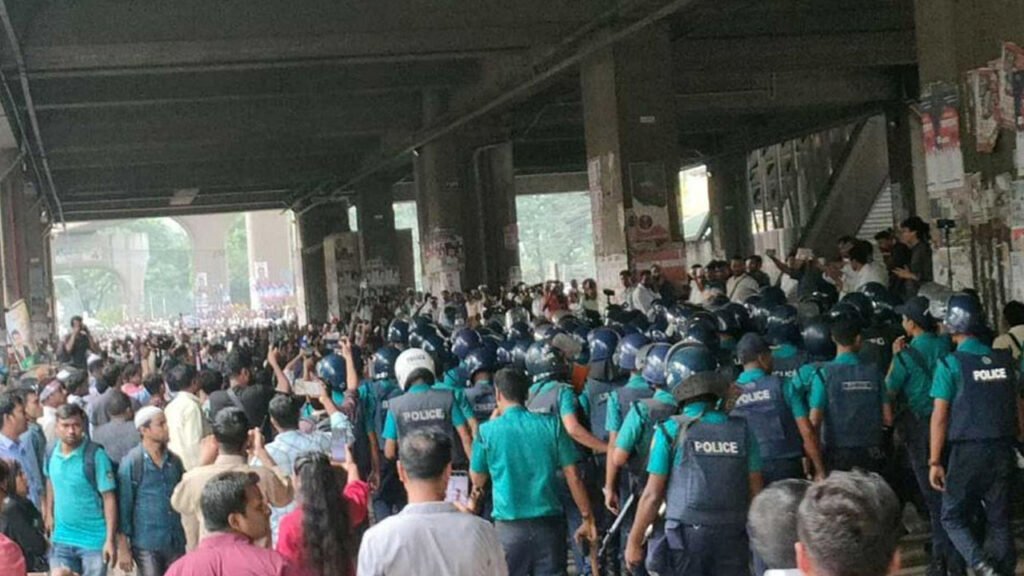 রোববার (১২ অক্টোবর) দুপুর ১টা ৫০ মিনিটের দিকে পুলিশ শিক্ষকদের ওপর জলকামান নিক্ষেপ করে। একই সময়ে সেখানে সাউন্ড গ্রেনেডের শব্দও পাওয়া যায়।